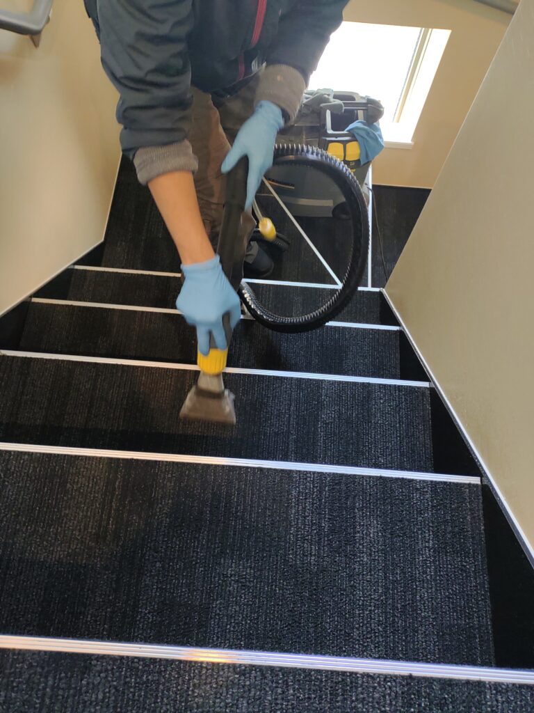 洗剤を塗布して汚れを浮かせたあとに、エクストラクターというカーペットやソファー洗浄で使う、汚れを吸い取る機械で、汚れを取り除いていきます。