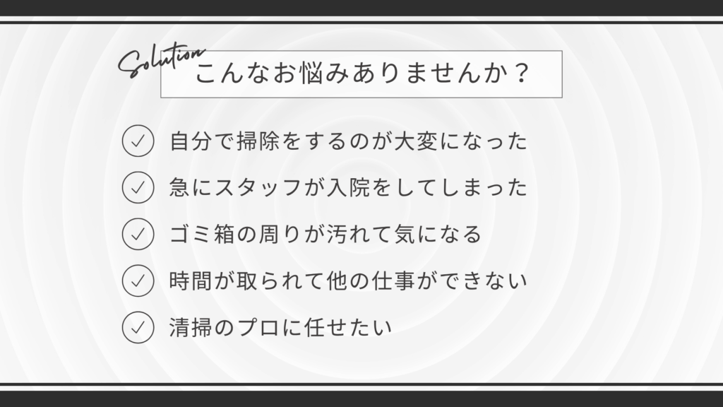 清掃スタッフが入院してしまったといった短期間の代打清掃もお任せください。安心して休んで笑顔で復帰。